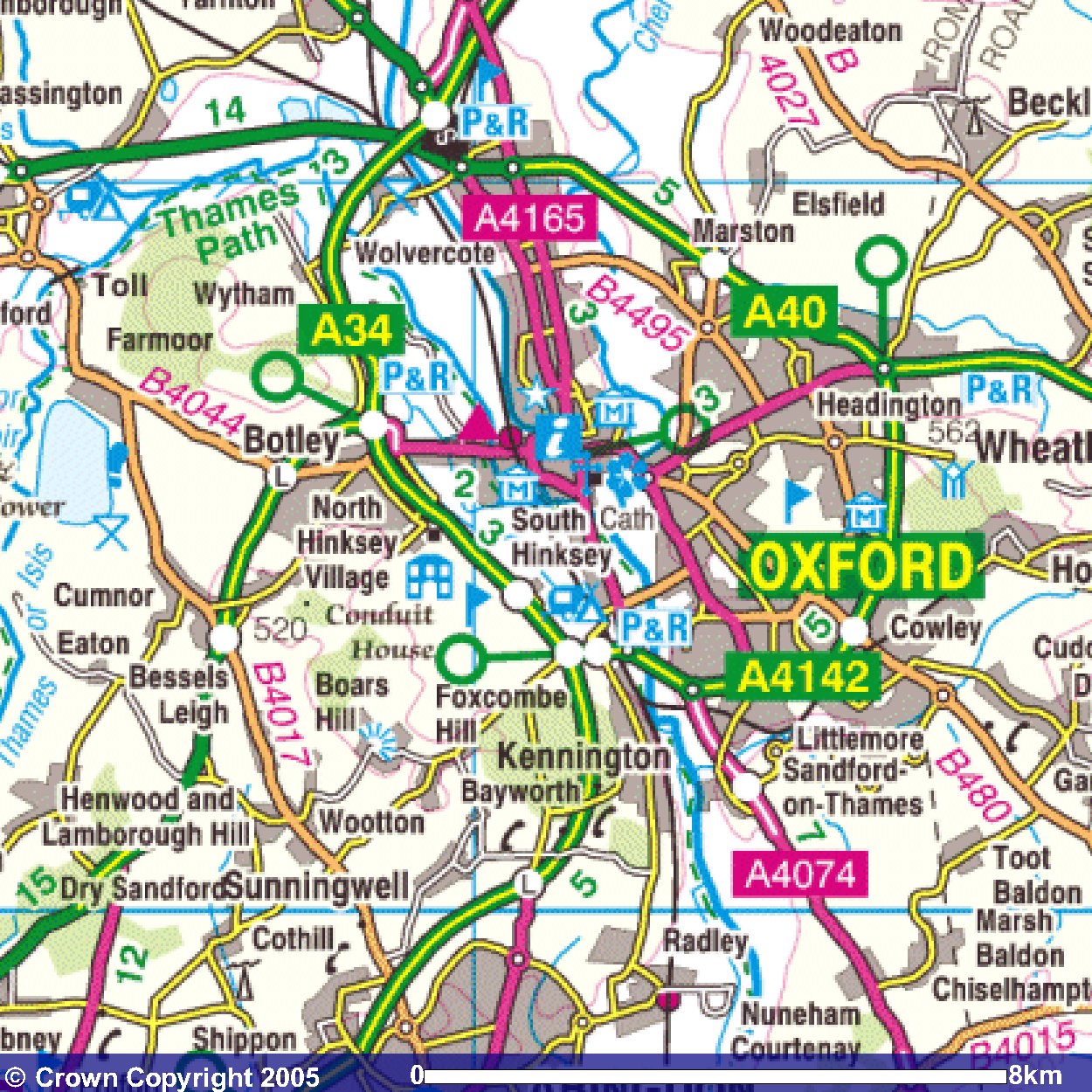 Abingdon is at the bottom left of this map. The first part of the route goes along country lanes through Radley to Little Radley. It's then across fields to join the Thames Path. The route follows the Thames northwards into Oxford where it jumps ship as it then follows the Oxford Canal (northwards from its southerly terminus). The route of the Oxford Canal is the blue line that is accompanied by the railway line. The end of the day's walk is at the Peartree Park and Ride which is at the top of the map. |