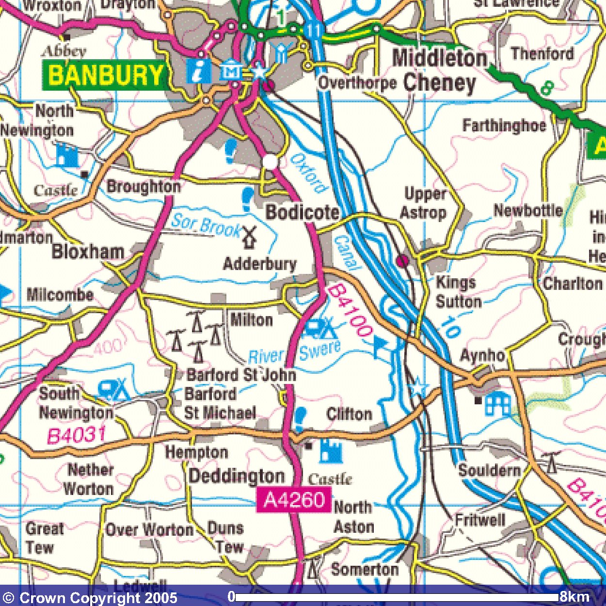The route starts at Heyford Wharf, which is a few miles south of the bottom of the map. Heyford Wharf is at Bridge 206 on the Oxford Canal. From there, it's northwards with the river Cherwell to the west and the railway line and the M40 to the east. Just south of Kings Sutton, the river crosses over the canal, and then the M40 crosses. All four (motorway, canal, river and railway) are close together at Kings Sutton. Today the route ends in Banbury. |