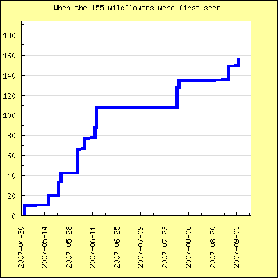 I've now got photos of 155 different wildflowers. The following table lists the first sighting of each flower.